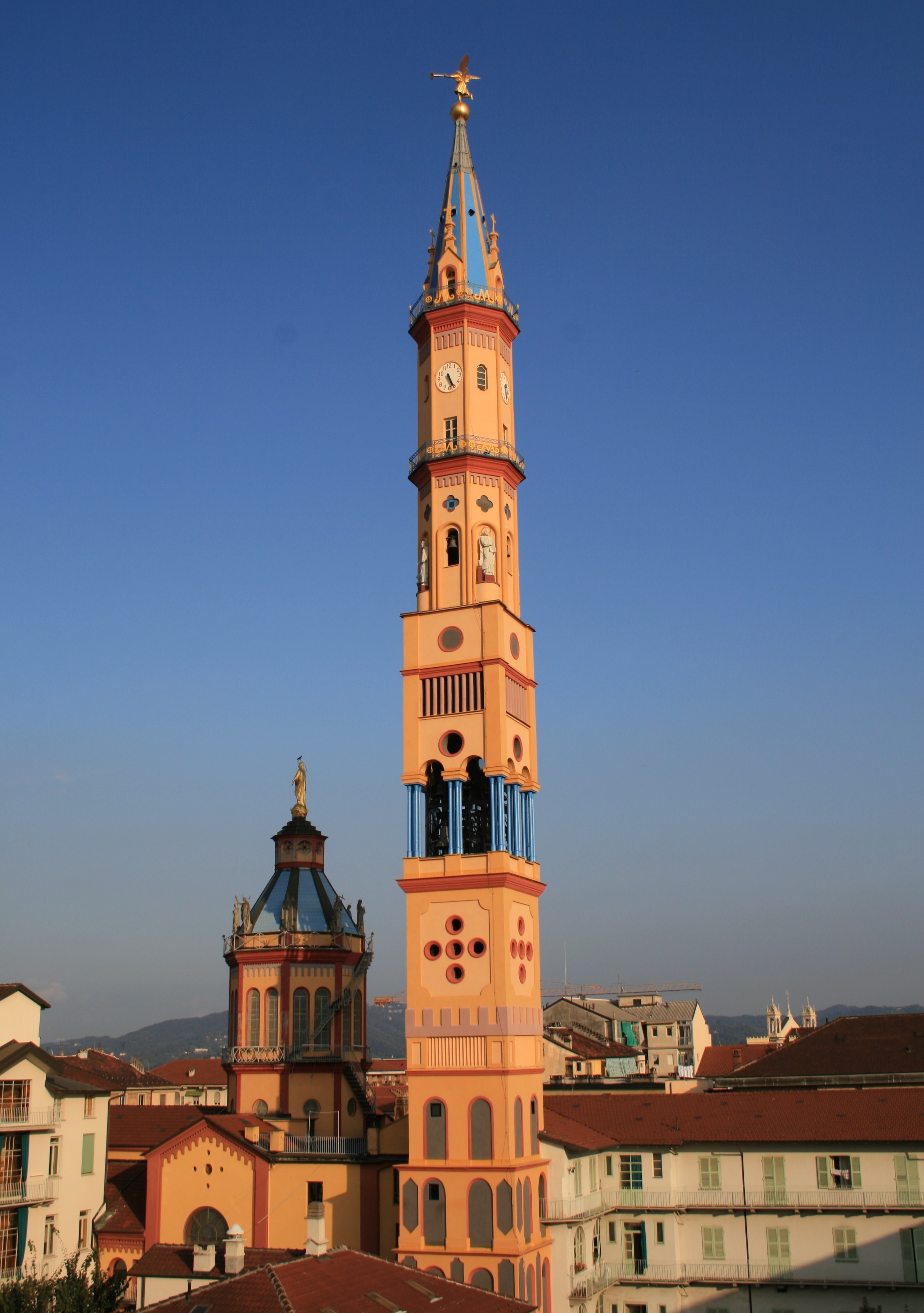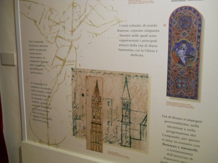 Il campanile è stato disegnato e progettato interamente da Francesco Faà di Bruno, sebbene non fosse propriamente né architetto né ingegnere, ma grazie alle Sue profonde conoscenze di grande matematico. I lavori, iniziati nel 1876, dopo l’ultimazione della Chiesa, si conclusero nel 1881. Il campanile ha un’altezza di 75 metri ed una base di soli 5 x 5 metri: si tratta in sostanza di una grande “matita” che svetta verso il cielo e che ancor oggi suscita l’ammirazione di ingegneri e docenti universitari. Il campanile, con i suoi 300 gradini, è strutturato in 14 piani, uno differente dall’altro, ed i visitatori salendo hanno modo di passare in mezzo alle otto grandi campane della cella campanaria e, in cima – dove era collocato un osservatorio astronomico – di ammirare un bellissimo panorama della città.
